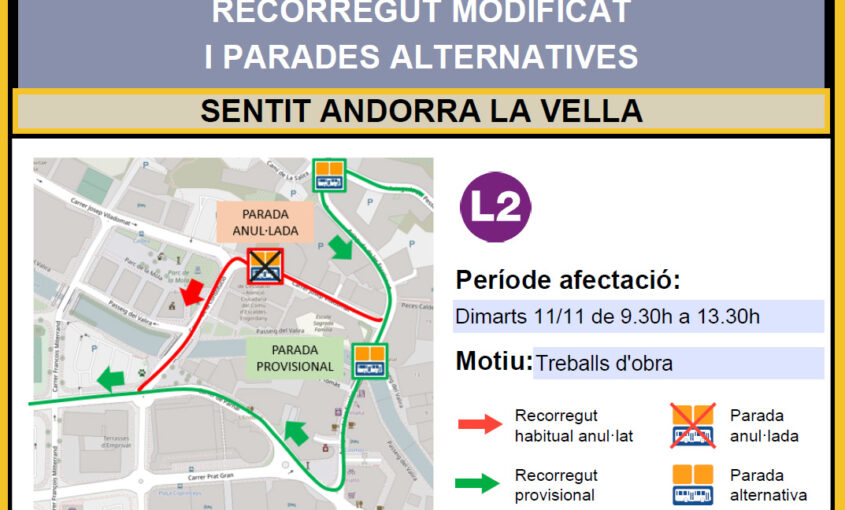 Tallat el Carrer Viladomat el dimarts 11 El proper dimarts 11 de novembre el Carrer Viladomat estarà tallat al trànsit de les 9.30h a les 13.30h a causa d’unes obres en aquesta zona. Els busos de la L2, en sentit Andorra la Vella, circularan per l’Avinguda de les Escoles, on hi haurà una parada provisional,