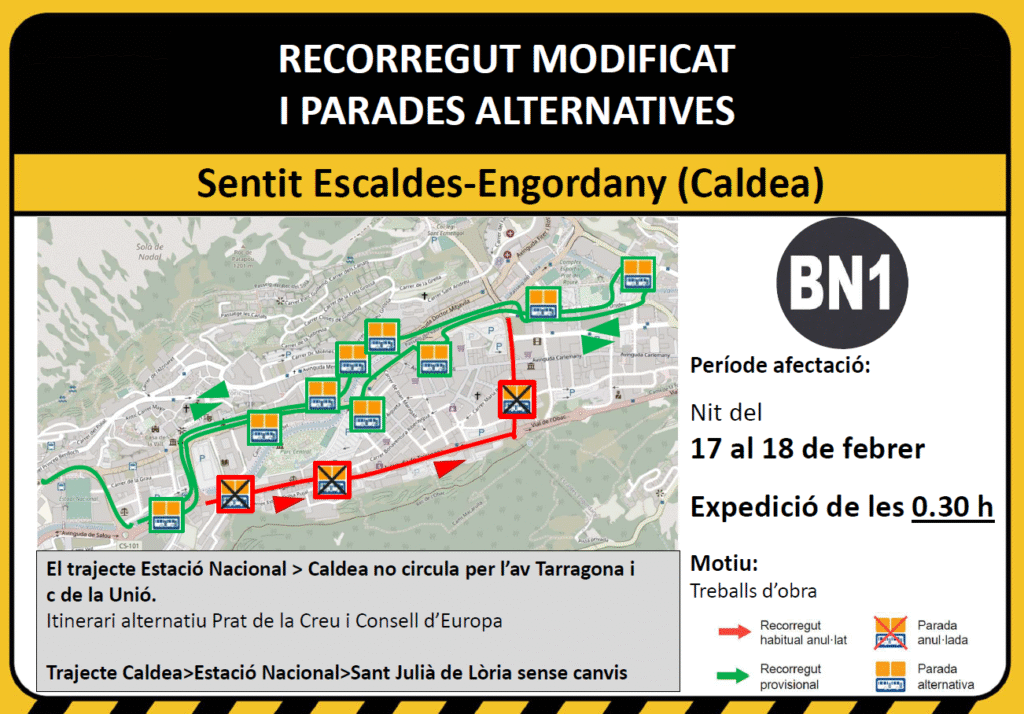La nit del 17 al 18 de febrer hi haurà un canvi de trajecte a la línia del Bus Nocturn BN1 (Sant Julià de Lòria – Escaldes Engordany), a causa d’uns treballs d’obra que tenen lloc a l’Av. de Tarragona.