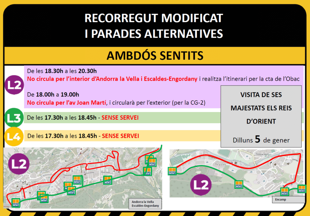 El servei de busos de la L7 quedarà anul·lat de 17.00h a 18.00h en els dos sentits de la marxa. A partir de les 18.30h i fins a les 20.00h, coincidint aproximadament amb el pas de la Caravana dels Reis Mags pel Carrer de la Unió, els busos de la L7 no circularan per l’interior d’Andorra la Vella i Escaldes-Engordany; ho faran pel Túnel dels Dos Valires.