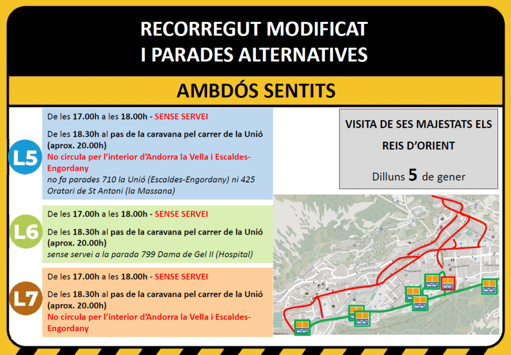 El servei de busos de la L5 quedarà anul·lat de 17.00h a 18.00h en els dos sentits de la marxa. A partir de les 18.30h i fins a les 20.00h, coincidint aproximadament amb el pas de la Caravana dels Reis Mags pel Carrer de la Unió, els busos de la L5 no circularan per l’interior d’Andorra la Vella i Escaldes-Engordany; ho faran pel Túnel dels Dos Valires. Durant aquesta franja les parades 710-La Unió i la 425-Oratori de Sant Antoni no estaran operatives.