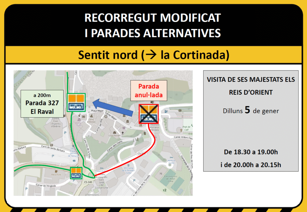 De 18.30h a 19.00h i de 20.00h a 20.15h, la parada 302-Portal del Riu quedarà anul·lada ja que els busos no circularan pel centre d’Ordino. La parada alternativa serà la 327-El Raval.