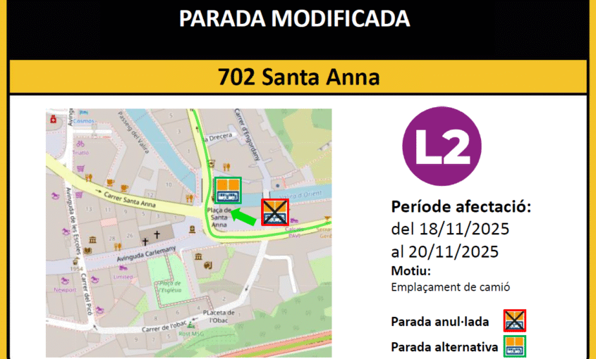 Emplaçament de la parada 702 – Santa Anna Us informem que del 18 al 20 de novembre el comú d’Escaldes-Engordany trasllada la parada 702 -Santa Anna uns metres més avall de la seva ubicació actual (s’ubicarà a on es trobava anteriorment). El motiu és l’emplaçament d’un camió en aquesta zona. Més informació al 760100.