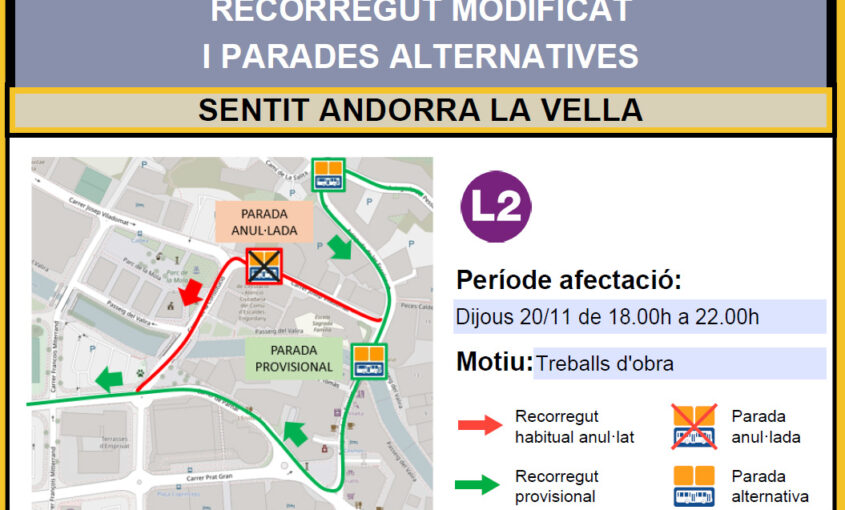 Tallat el Carrer Viladomat el dimarts 11 El proper dimarts 11 de novembre el Carrer Viladomat estarà tallat al trànsit de les 9.30h a les 13.30h a causa d’unes obres en aquesta zona. Els busos de la L2, en sentit Andorra la Vella, circularan per l’Avinguda de les Escoles, on hi haurà una parada provisional,