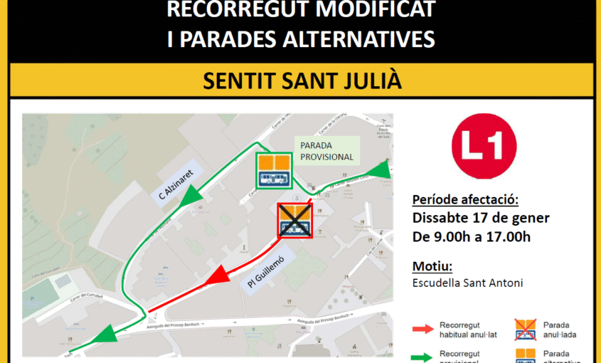Canvi de trajecte a la L1 per l’Escudella de Sant Antoni Aquest dissabte 17 de gener, de les 9.00h a les 17.00h, la Plaça Guillemó estarà tallada al trànsit a causa de la celebració de l’Escudella de Sant Antoni. Per aquest motiu, els busos de la L1 en sentit Sant Julià de Lòria circularan pel