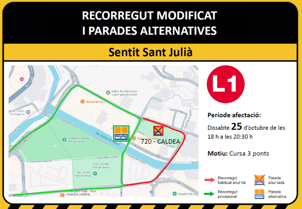 La parada 720 – Caldea quedarà anul·lada el dissabte 25, de les 18h a les 20.30h a causa de la Cursa 3 Ponts.