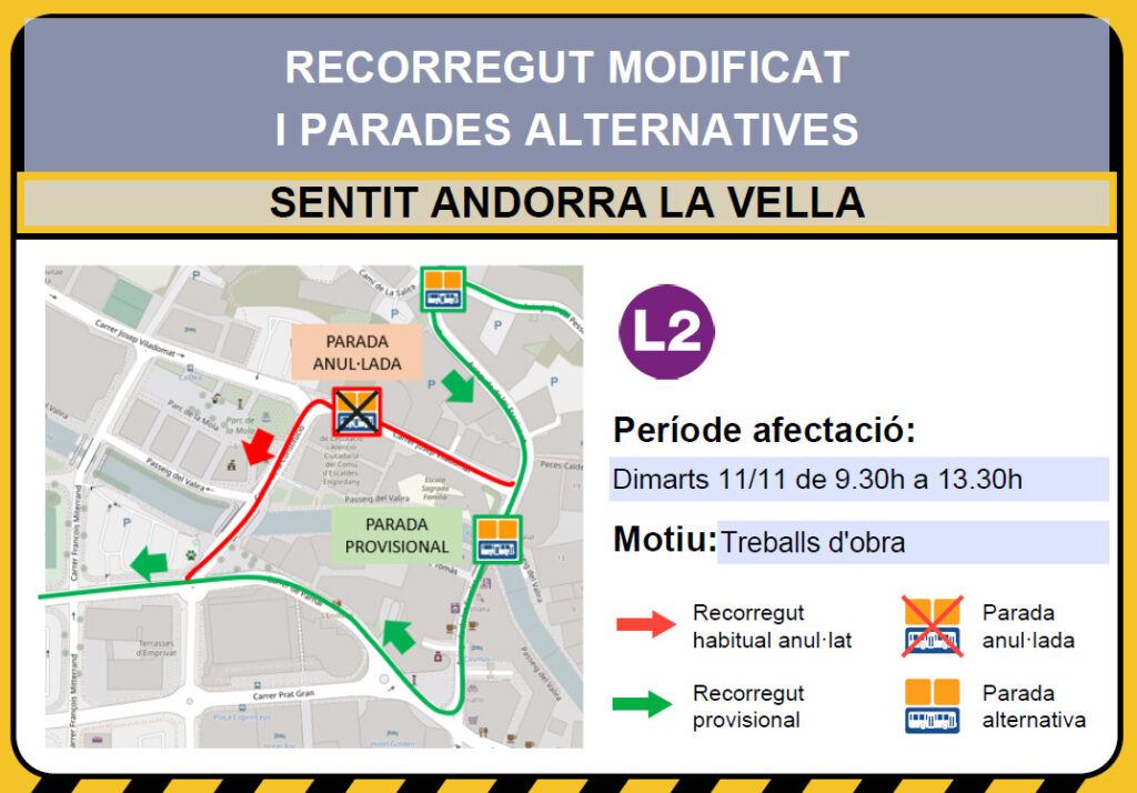 Els busos de la L2, en sentit Andorra la Vella, circularan per l’Avinguda de les Escoles, on hi haurà una parada provisional, i pel Carrer del Parnal. A partir d’aquí seguiran el trajecte habitual.