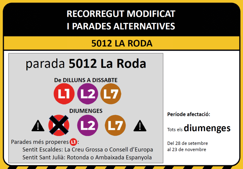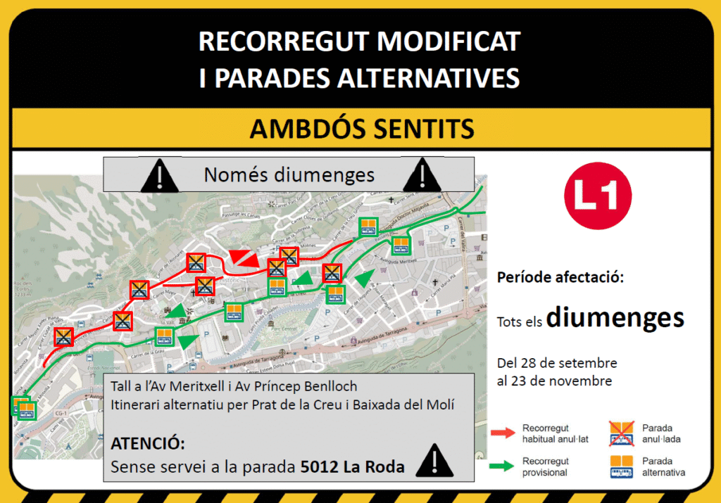 Per aquest motiu, la L1 circularà pel Carrer Prat de la Creu i Baixada del Molí en ambdós sentits de la marxa. Les parades seran les instal·lades i marcades habitualment en aquest recorregut, menys la 5012 – LA RODA, que no tindrà servei el diumenge.