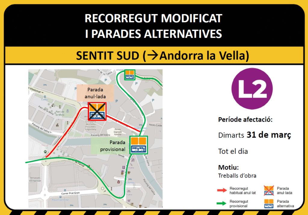 Aquest dimarts 31 de març el Carrer Viladomat estarà tallat durant tot el dia a causa d’unes obres en aquesta zona. Això afecta als busos de la L2, en sentit Andorra la Vella, que seguiran recte per l’Avinguda de les Escoles i giraran pel Carrer del Parnal per enllaçar amb el trajecte habitual de baixada.