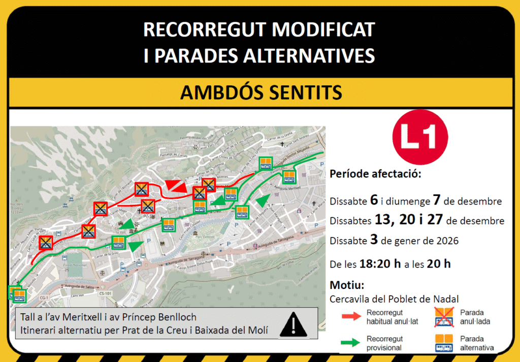 Per aquest motiu, els busos de la L1 circularan, en ambdós sentits de la marxa, pel Carrer Prat de la Creu i seguiran per la Baixada del Molí a partir del qual enllaçaran amb el recorregut habitual.