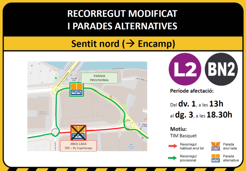 Els busos de la L2 i BN2, en sentit pujada, circularan pel Carrer de la Constitució i Carrer del Parnal on s’hi ubicarà una parada provisional. La parada 705 – Pl. Coprínceps quedarà temporalment fora de servei.